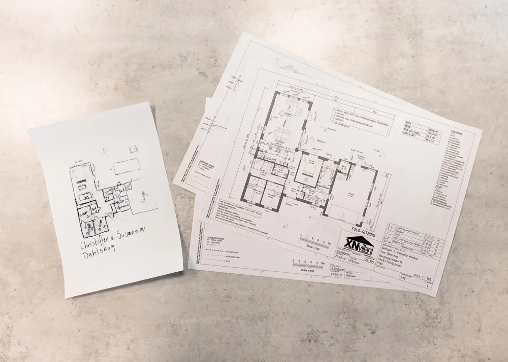 - I princip allt det vi hade ritat själva gick att genomföra och arkitekten hjälpte oss med de sista pusselbitarna och några smarta förändringar som gav oss en bättre planlösning. Det var förvånansvärt smidigt att förvandla vår egna skiss till en färdig ritning!