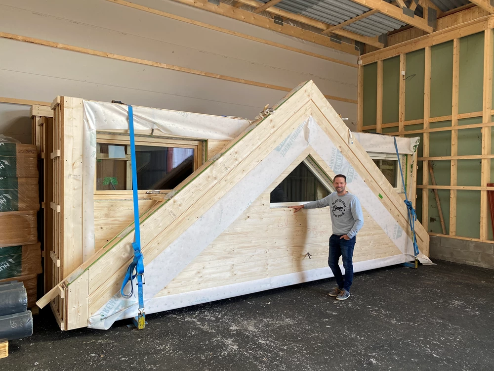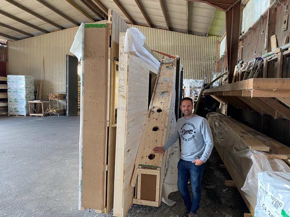 Tidigt på morgonen rullar den första lastbilen in till Himlabackarna och fram till plattan där stommen ska resas. Christoffer är på plats tillsammans med Martin från XNvillan för att ta emot teamet som ska montera stommen och de kör snabbt igång när lastbilen öppnat upp gaveln för att lasta av.