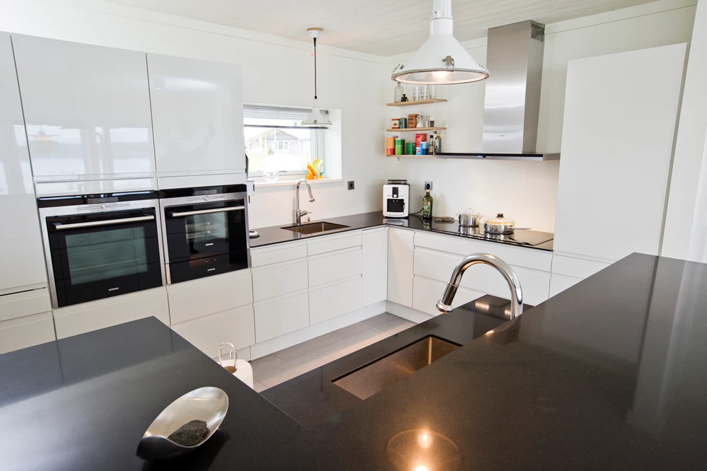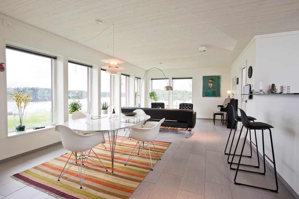 Enplansvillan på 120 kvadratmeter har två huskroppar som möts i mitten, med ett utlöp mot stranden. Till detta har paret också byggt en gäststuga på 30 kvadratmeter och de har renoverat garaget som fanns där sedan tidigare. Där förvarar de all teknik, till exempel bergvärmepump, som via kulvert förser huset och gäststugan med värme. Energimässigt är huset en fullträff.